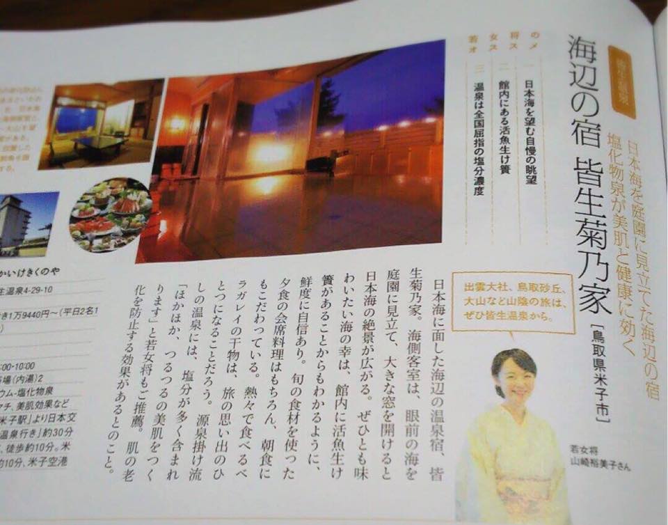 素敵な女将がいる温泉宿特集にて。ぜひご覧ください♪ ただ、目次のページ…残念ながら『島根県 皆生菊乃屋』となっています(涙)